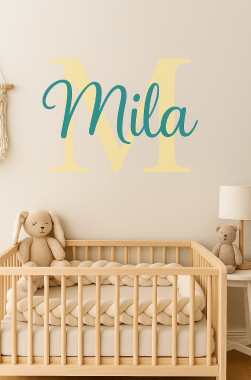 A cheerful yellow “M” beams behind the playful teal script of “Mila,” radiating brightness and personality. Paired with cozy neutrals and soft textures, this piece brings a sunny and spirited vibe to any nursery. A perfect match for a joyful little soul.
